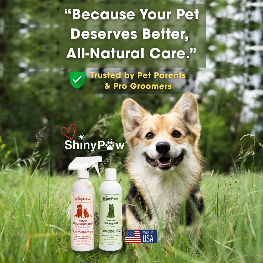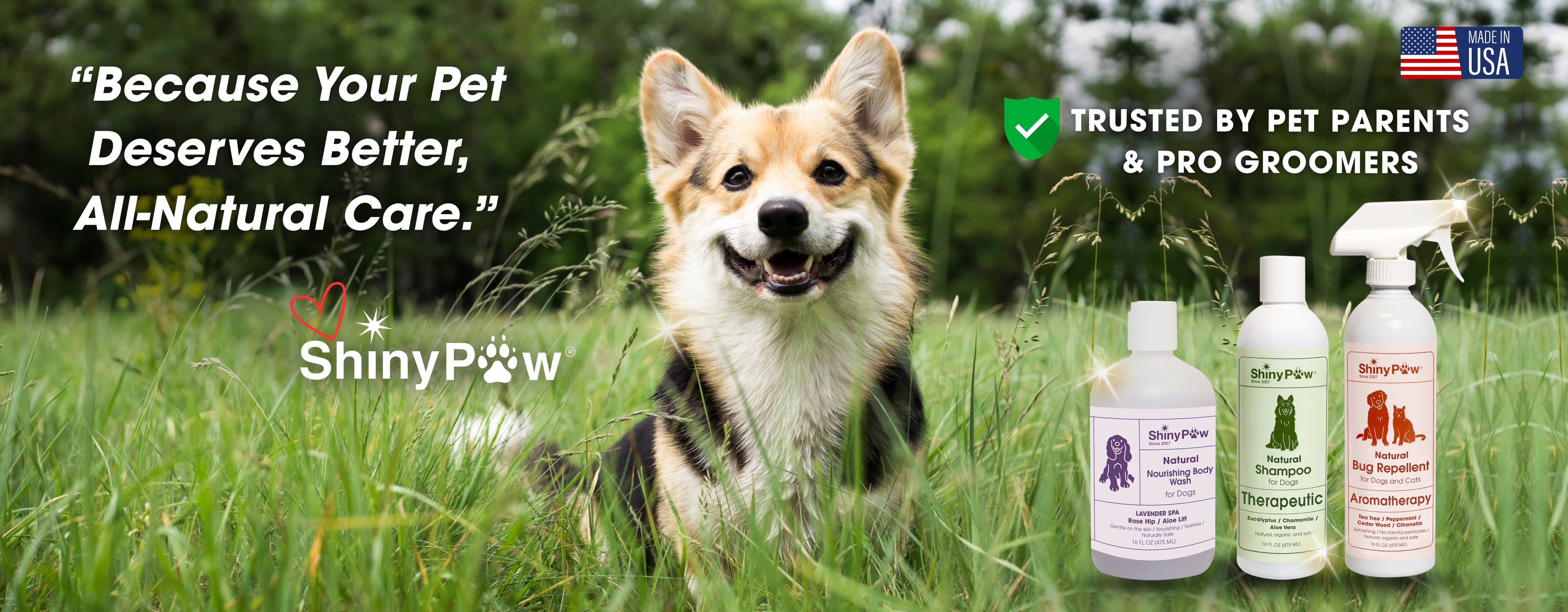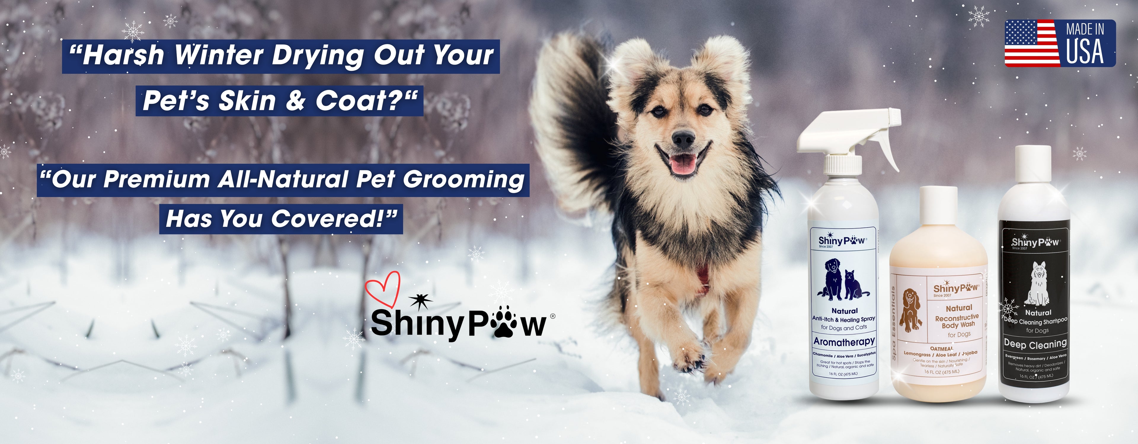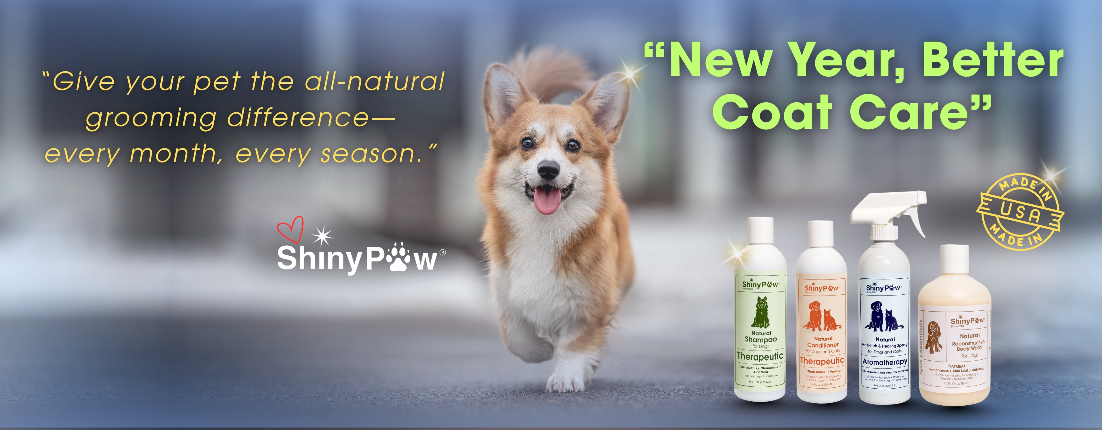 The Shiny Paw® All-Natural Problem Solver™ pet coat and skin care product line includes dog and puppy shampoos and body washes, cat and kitten shampoos, cat and dog conditioners and detanglers, cat and dog ear cleaners, pet anti-itch healing sprays, cat and dog coat fresheners and pet bug repellents.